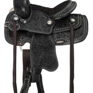 Perfect for young riders who need both comfort and durability in the arena. This beautifully crafted saddle showcases a Medium/Black combination of floral tooling on the skirts, pommel, and cantle, providing an elegant yet rugged look. The rough-out fenders and jockeys are complemented by a tooled border, adding to the saddle’s unique design.